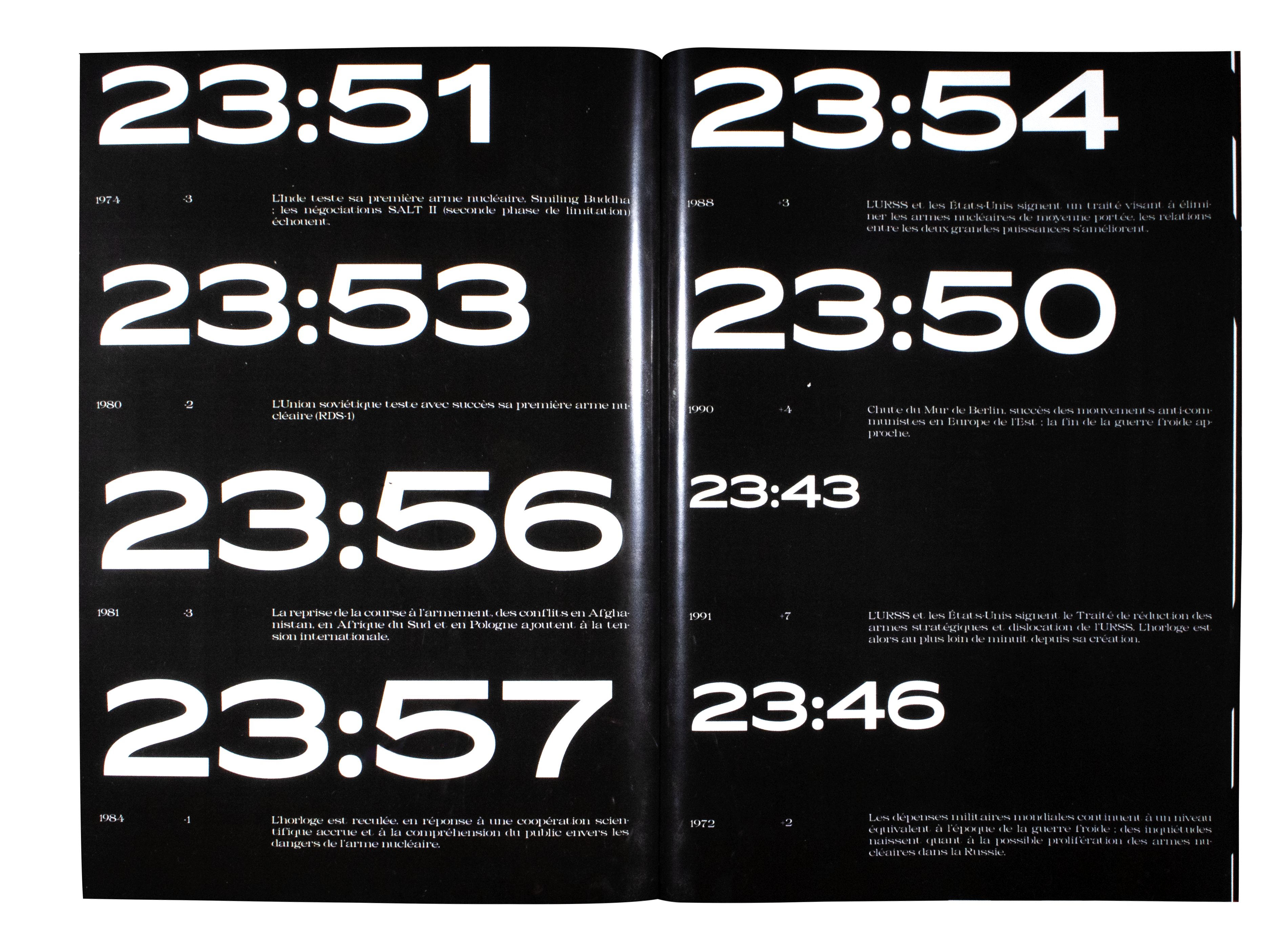 Serenity is a magazine realized during a workshop with the graphic designer Nicolas Polli. The theme was security and the subject chosed to treat visually is the "Doomsday Clock". The objectif was to treated every minute since it’s creation and it’s last update live.